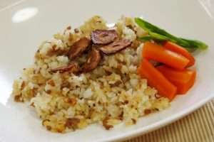 - みじん切りしたニンニク2片、玉ねぎ1/2個、人参1/2本ほどを油でいため、しんなりしたらご飯を加える