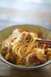 生姜、豆板醤、コチュジャンを加えて春雨と炒め合わせれば、簡単にチャプチェができます。