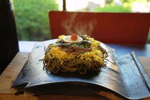 ホットプレートを加熱してそばを香ばしく焼いてそばつゆにつけて食べると、ボリュームたっぷりの瓦そばに変身です。