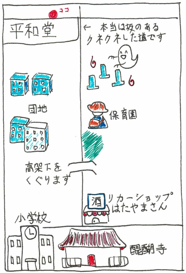 スタート地点は、私の地図(上記)でいうリカーショップはたやまさん(お酒屋さん)前の交差点です。