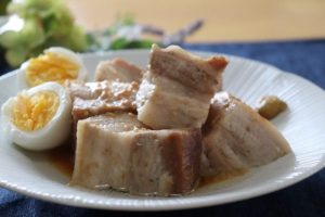 - 酒・砂糖・醤油の煮汁でチャーシューに