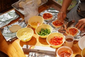 バーベキューでピザをすぐに焼けるように、家で生地に具を全部乗せた状態で数時間持ち歩きました。