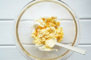 フィリングは、ゆで卵をつぶし、マヨネーズや塩コショウで和えた状態のものです。