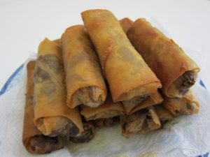 6. (5)を春巻きの皮に巻き、高温で皮がキツネ色になるまで揚げる