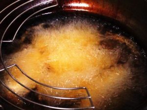 - 油のパチパチという音が小さくなってきたら、油切りをして完成