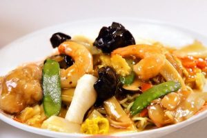 中華麺(蒸し麺)をカリっと焼いて、酢豚を乗せるだけです。