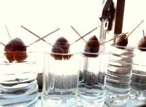 種に爪楊枝をさして容器に引っかけ、水に半分くらい種を浸けておくと、1ヶ月くらいで根が出て発芽します。