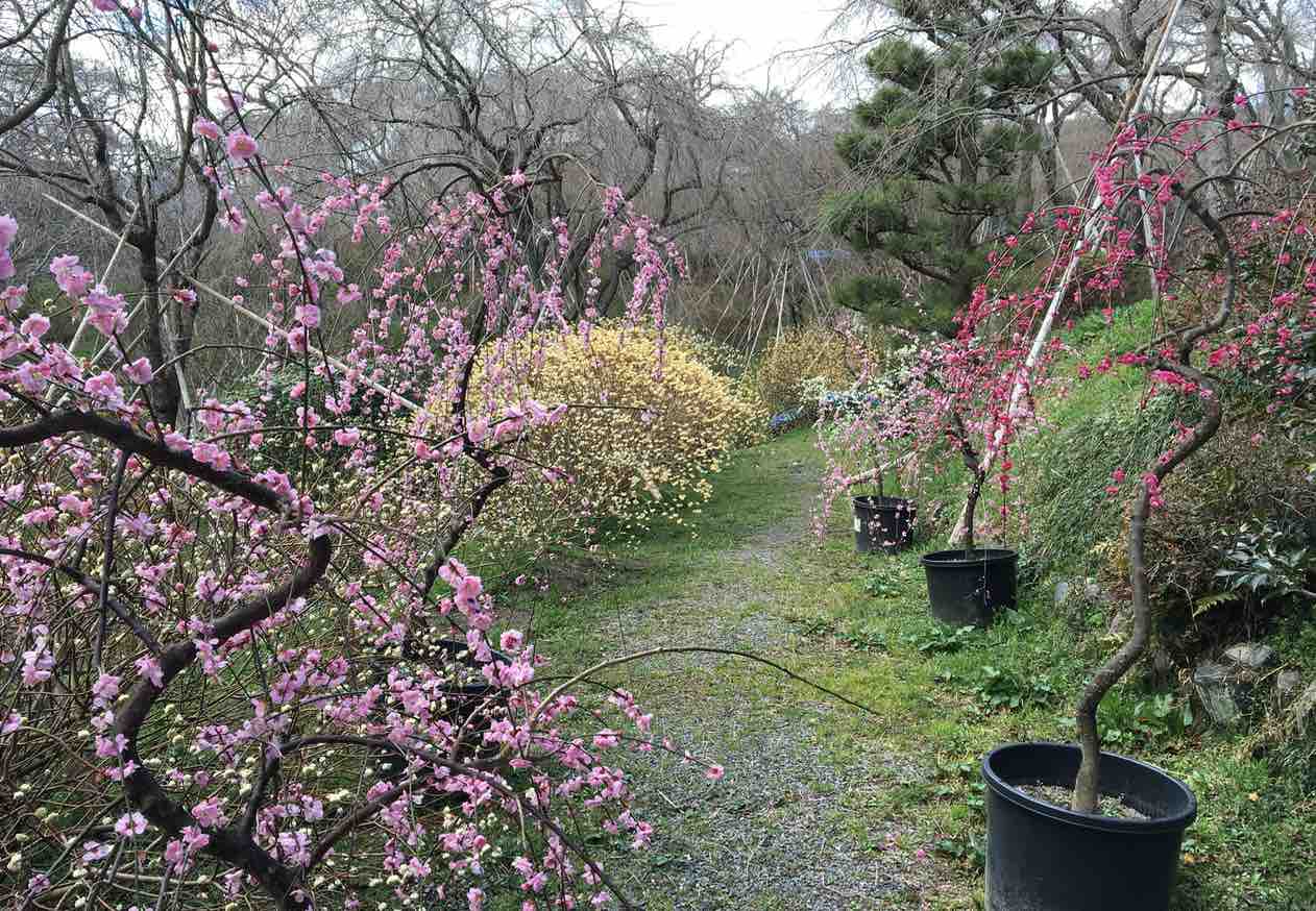 原谷苑には八重紅しだれ桜(見頃は4月中旬頃)を中心として多くの種類の桜があり、見頃の時期が長いのも特徴です。
