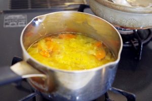 - 1を弱火にかけ、沸騰する前に昆布を取り出す(ぬめりが出ないように)