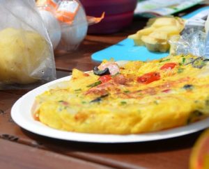 スパニッシュオムレツは、ジャガイモやパプリカ・ベーコンなど、具材がたっぷり入った円盤型のオムレツです。