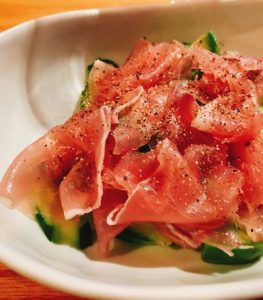 - 生ハムをカットするときに、脂肪を薄くスライスして数枚を残しておく
