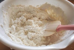 3. 卵黄を加えてよく混ぜ、薄力粉をふるい入れ、ひとまとめになるように混ぜる