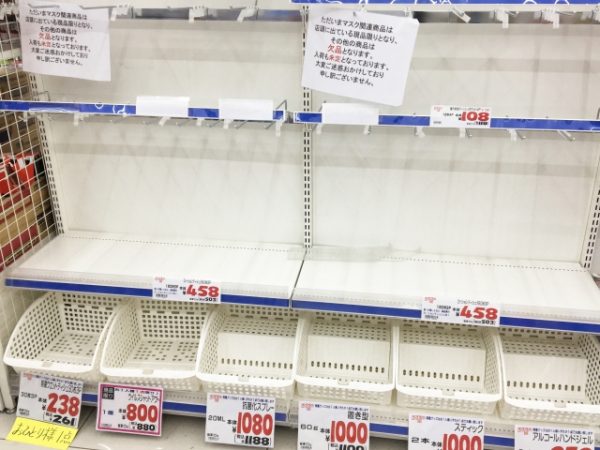 実際に開店前のドラッグストアに行列ができて、入荷分の消毒液が開店と同時に売り切れという状況が続いています。