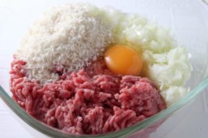 - 合い挽き肉は牛7:豚3か牛6:豚4で用意する