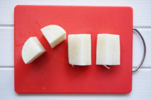 1. 大根(10cm)を2cmの厚さに輪切りし、皮を剥いてからそれぞれを半分にカットする