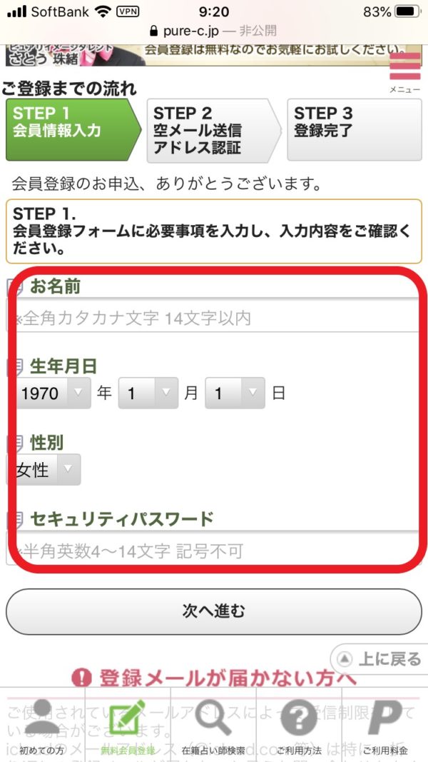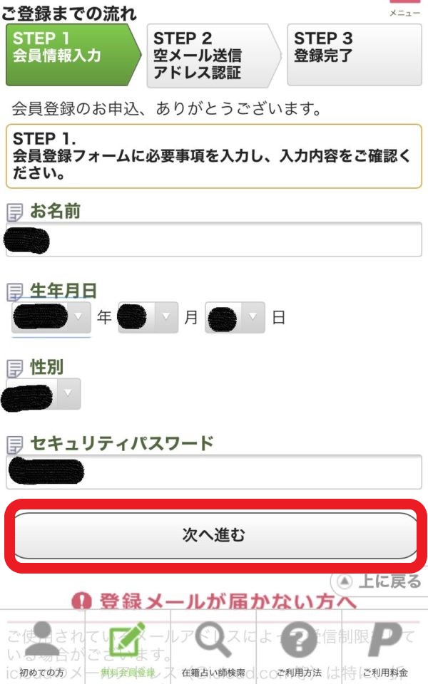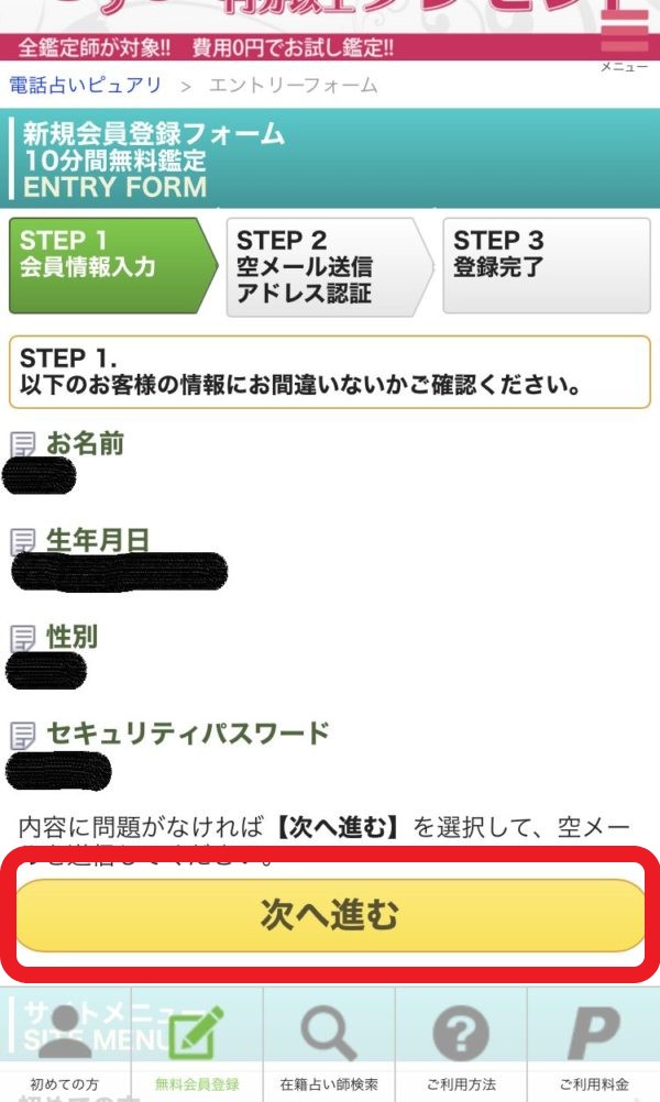 名前・生年月日、性別、セキュリティパスワードの4項目を入力して【次へ進む】をタップします。