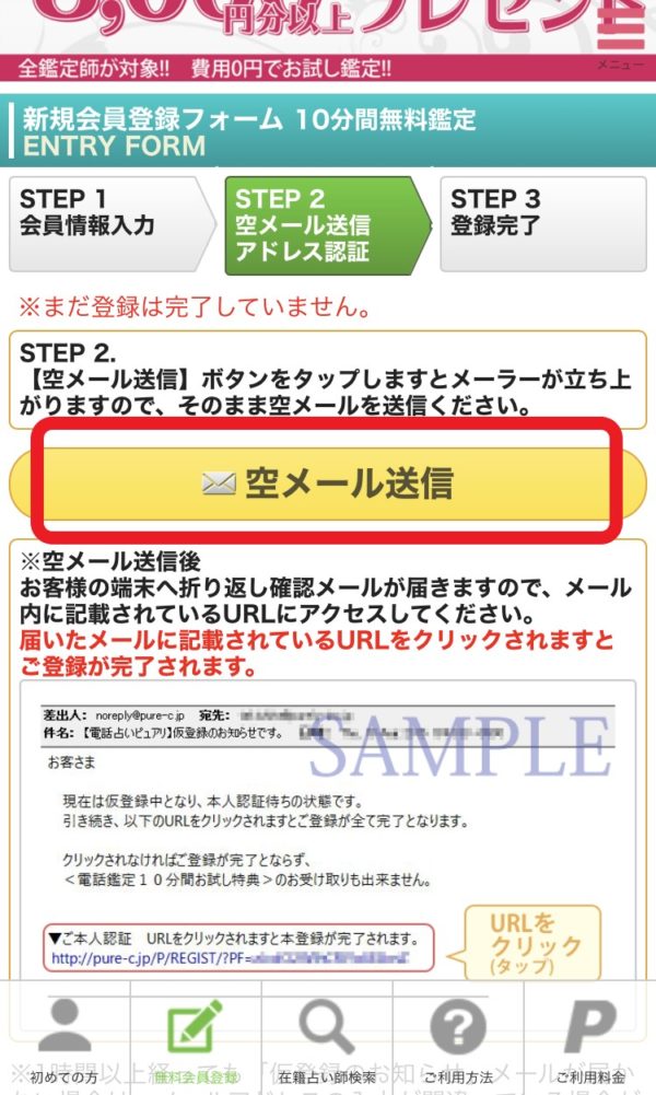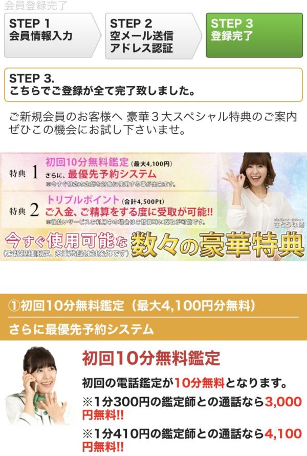 ピュアリでは無料で会員登録をすると、今なら初回鑑定の際に10分間無料特典が用意されています。
