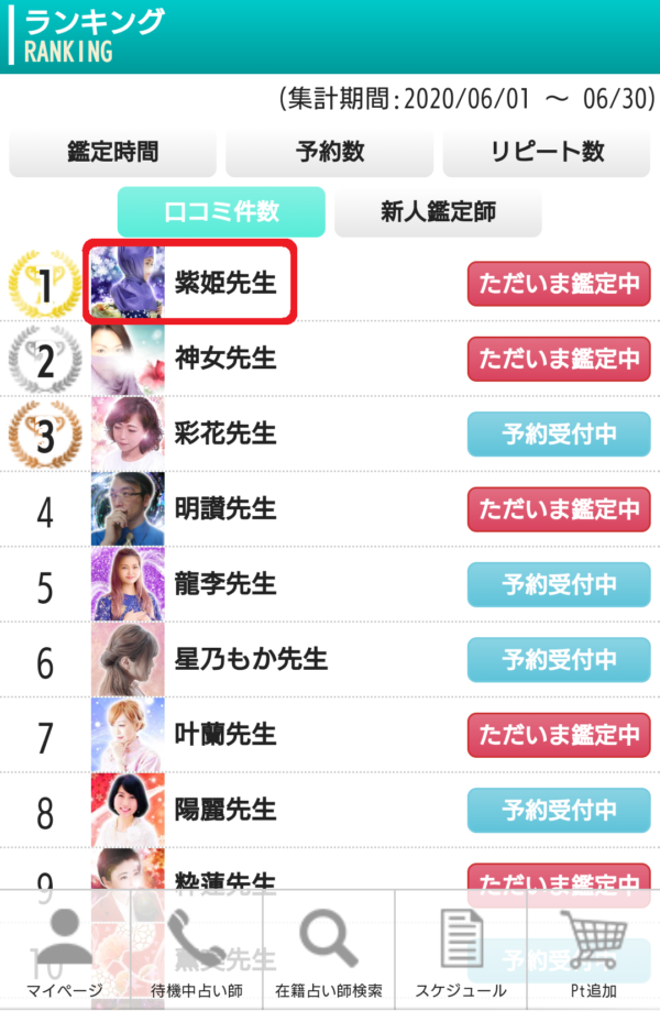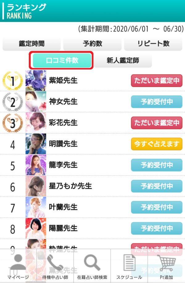 ピュアリのトップページには在籍の占い師さんがずらりと紹介されていますが、スクロールすると「ランキング」が見られます。ここで「口コミ数」や「リピート数」など切り替えられるので、気になるランキングを参考にしてみてください。