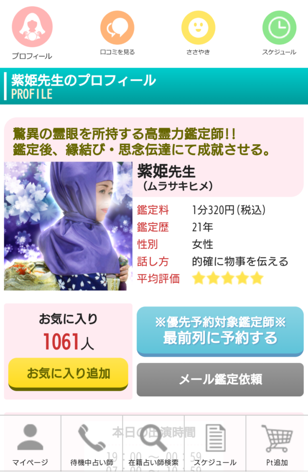 予約の受付開始はAM0:00からで、本日待機スケジュールのある鑑定師のプロフィールページにて予約ができます。なお、予約するのに費用はかかりません。また、初回鑑定は最優先予約が可能なのでお試しください。