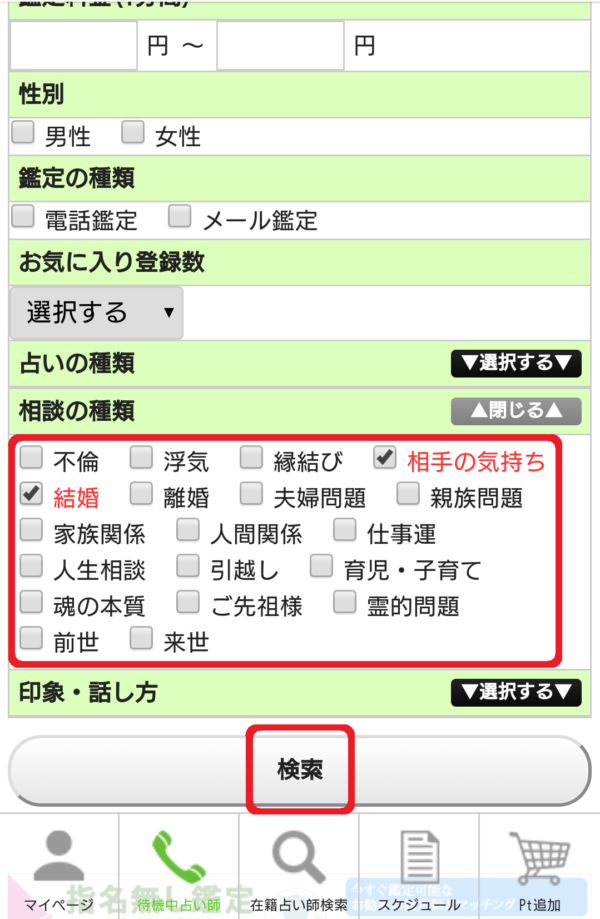 「相談の種類」から相手の気持ちや結婚など、相談内容に応じてチェックして【検索】をタップすると、希望のお悩みに精通した先生の一覧が表示されます!