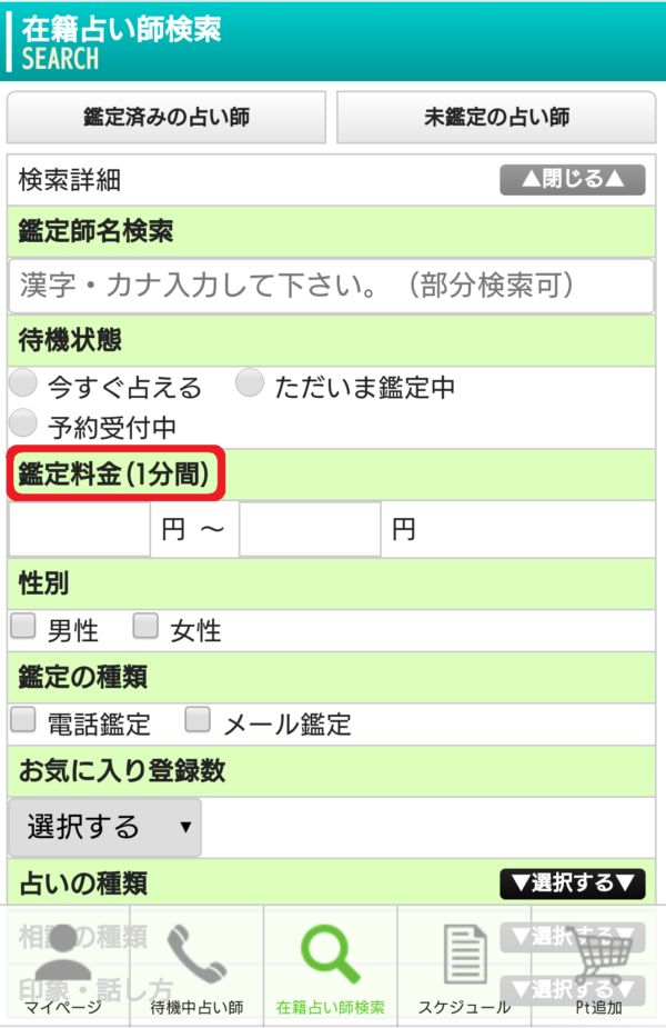 トップページメニューの「占い師検索」→「在籍占い師検索(待機中占い師検索)」の順にタップし、「鑑定料金(1分間)」の枠に「いくらからいくらまで」を入力して検索することで、希望する料金の占い師一覧が表示されます。