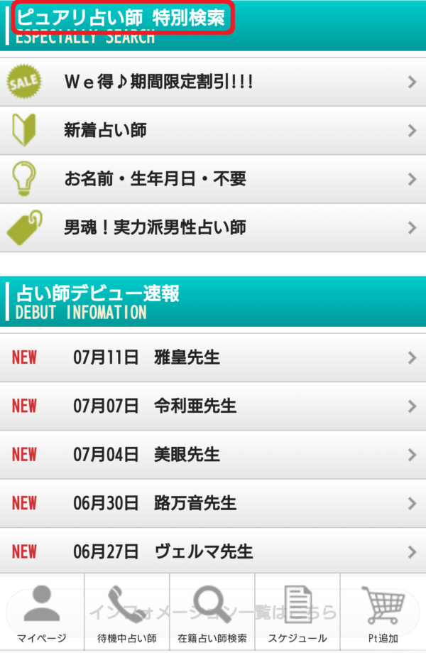 さらに「ピュアリ占い師 特別検索」でも、期間限定で割引料金の先生や名前や生年月日は不要で占ってもらえる先生なども検索できますよ。こちらの検索画面は、トップページをしばらくスクロールして「ランキング」の下にあります。