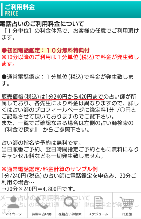 | 料金体系 | 1分あたりの鑑定料金 × ご利用時間 1分あたりの鑑定料金 240~420円(税込) |