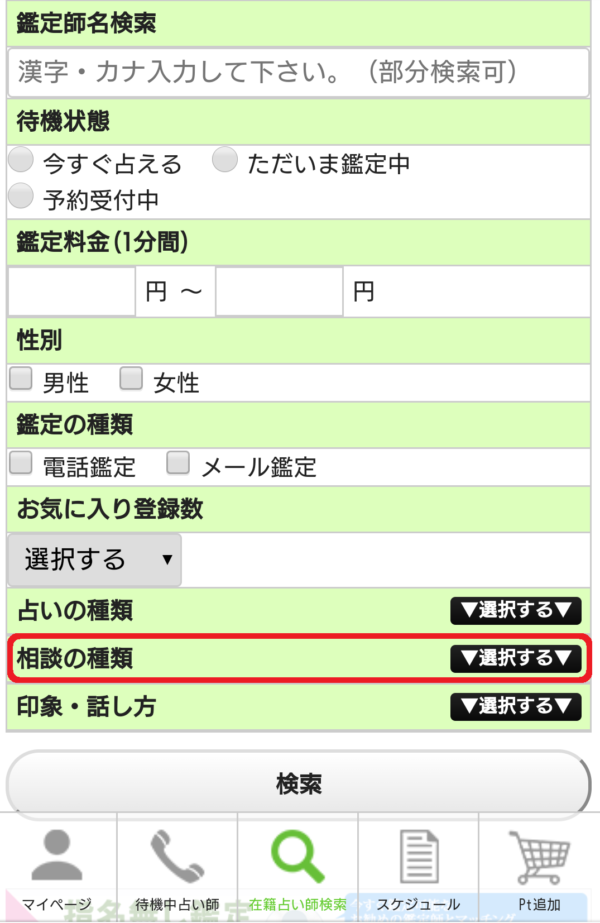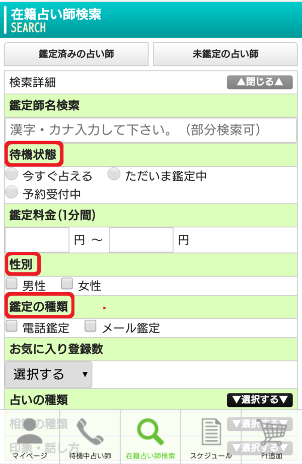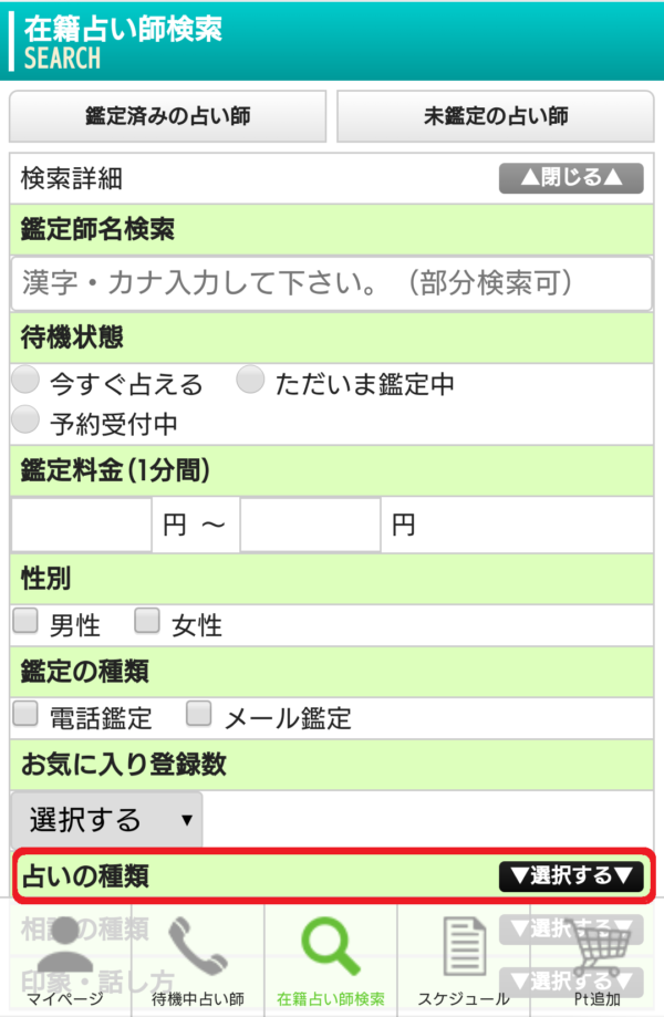 すぐにでも相談したい場合は、「待機状態」の「今すぐ占える」を選択しましょう。占い師さんの性別が気になる場合も、ここで選択できます。また、電話鑑定かメール鑑定を選ぶことで、より絞り込んだ検索が可能です。