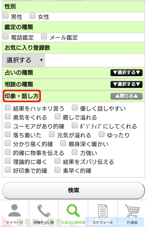 より相性が合う占い師さんを探したい場合は、「印象・話し方」であなたが希望する先生のタイプを選択してから検索しましょう。