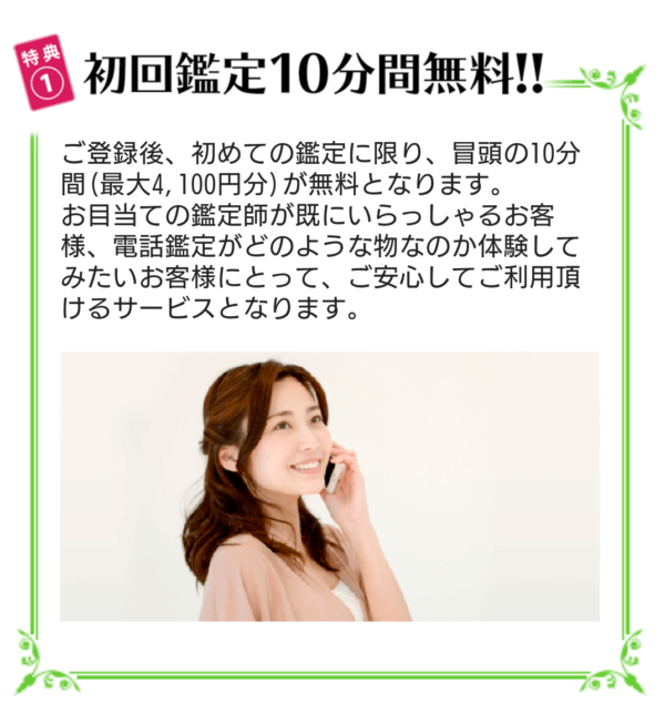 今なら、初回鑑定の際に10分間無料で鑑定を受けられます。初めての利用で10分間の無料鑑定が自動的に適用されるので、お得に相談しちゃいましょう!