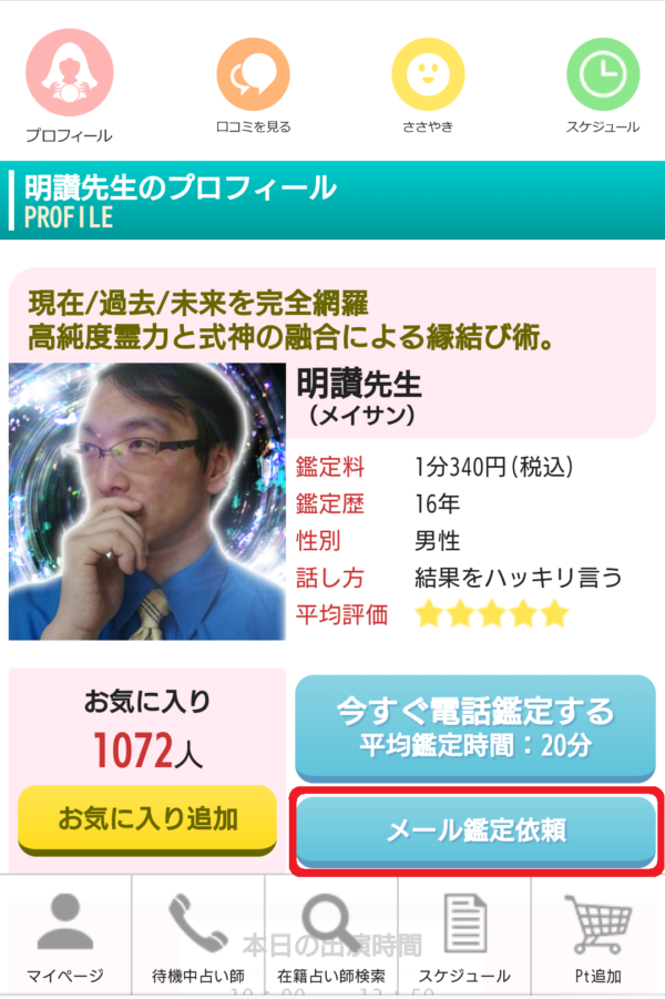 プロフィール画面の「メール鑑定依頼」ボタンが、グレーではなく青色の先生はメール鑑定にも対応していますよ。