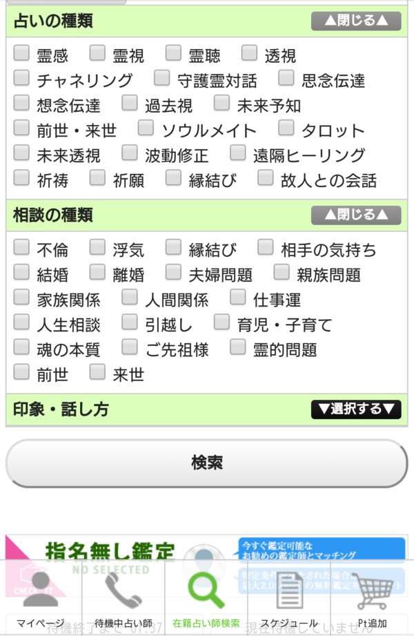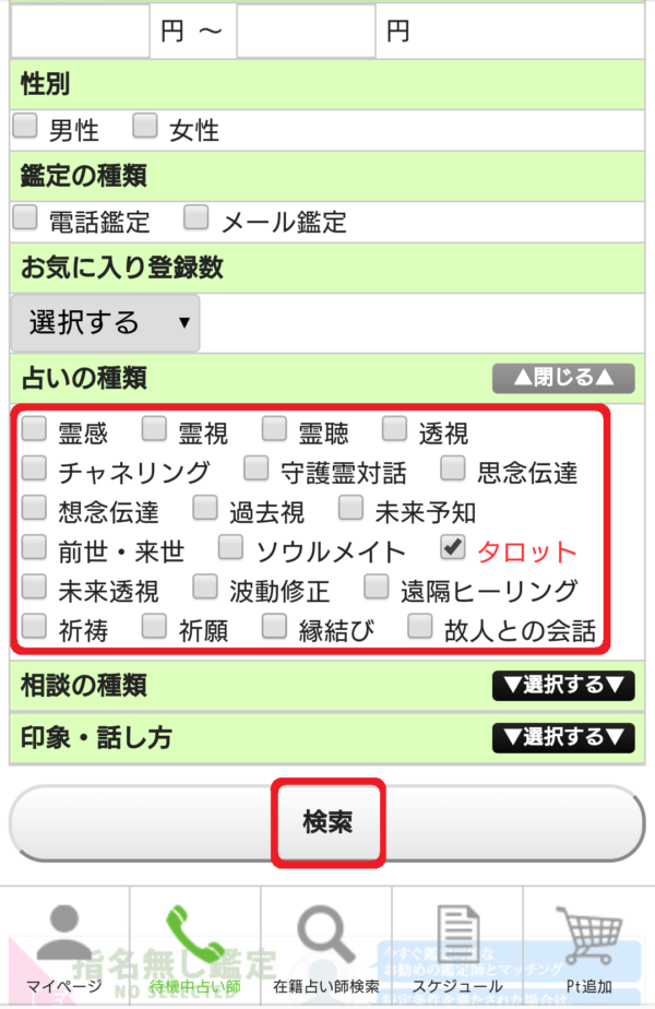 トップページメニューの「占い師検索」→「在籍占い師検索(待機中占い師検索)」の順にタップし、画面下部の「占いの種類」からタロットカードなど希望の占術にチェックして検索すると、選んだ占術に精通した先生の一覧が表示されます!
