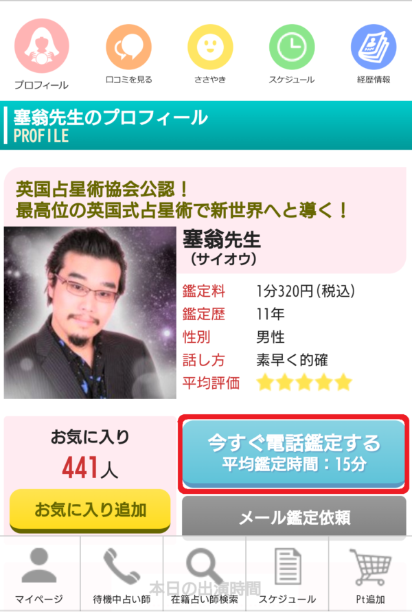 プロフィールページで選んだ先生の平均鑑定時間が確認できます。占い師の先生を決めたら「今すぐ電話鑑定する」をタップしましょう。