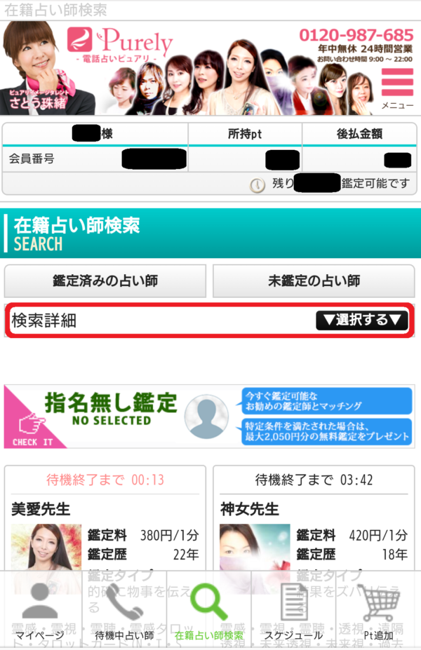 「在籍占い師検索」ページが表示されたら「検索詳細」をタップします。