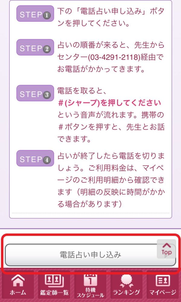 「電話占いお申込み」画面がひらきます。下へスクロールし、「電話占い申し込み」をタップすると申し込みが完了です!