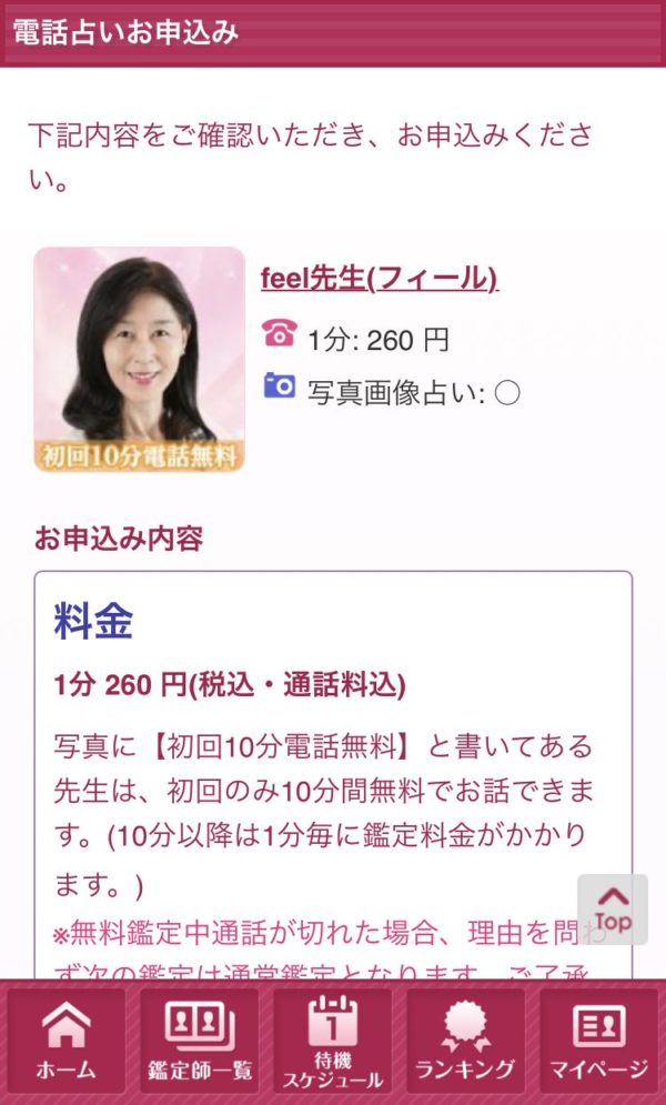 | 料金体系 | 1分あたりの鑑定料金 × ご利用時間 1分あたりの鑑定料金 190円~(税込) |