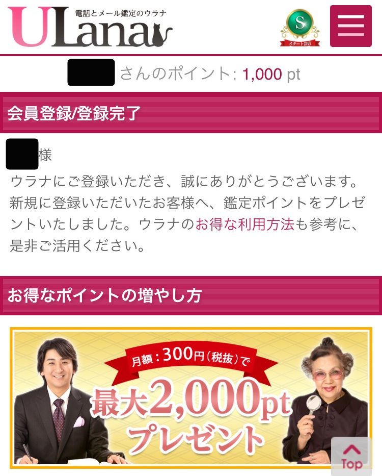 ウラナに会員登録をすると、すぐに1,000pt(ポイント)がプレゼントされます。