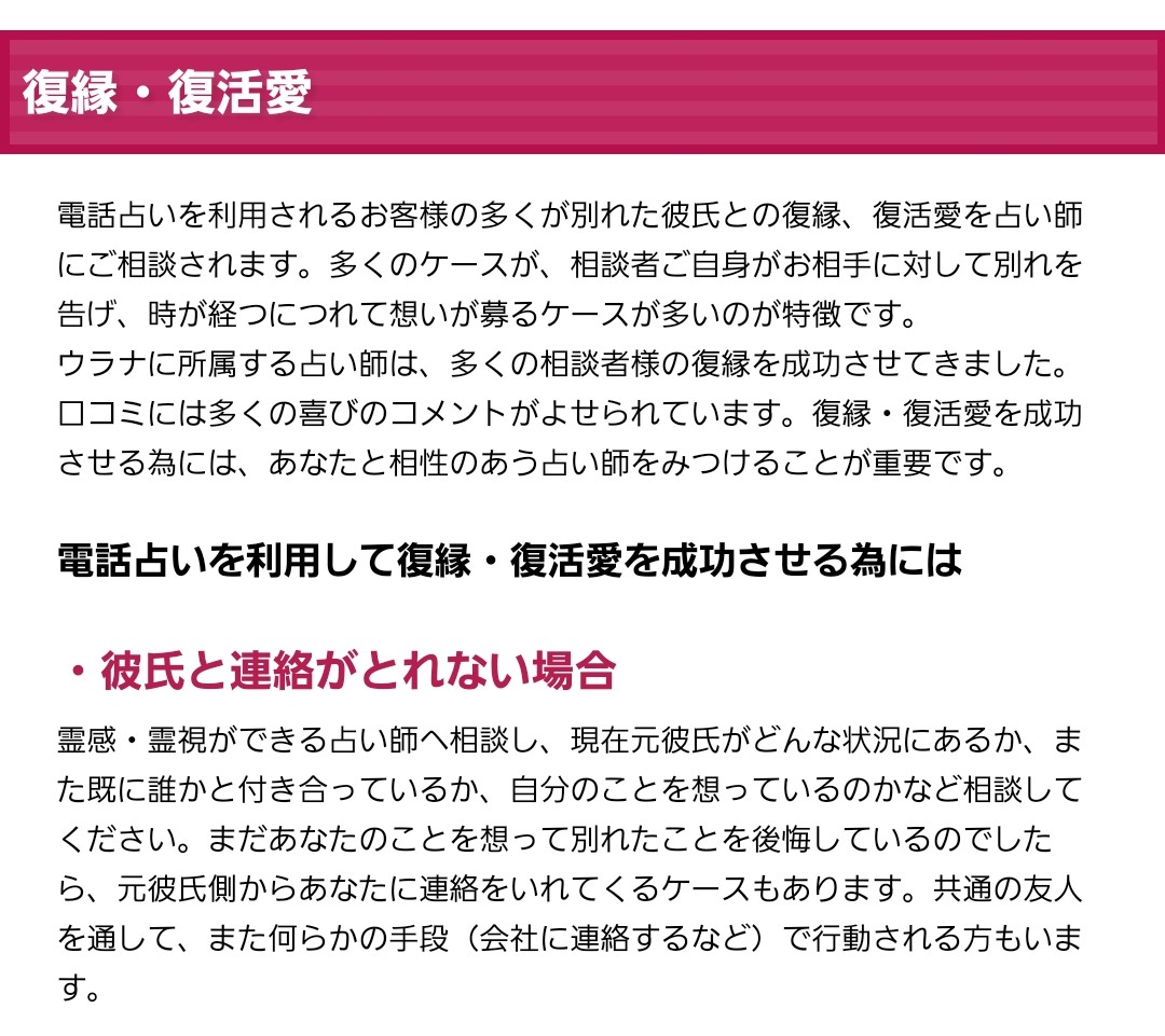 ウラナ以外の電話占いサービスもよく利用する高田です。ウラナの占い師は、占いの質と対応が安定しているのが魅力ですよ!私も恋愛相談をして、ダメになりかけていた彼との仲が復活しました♪