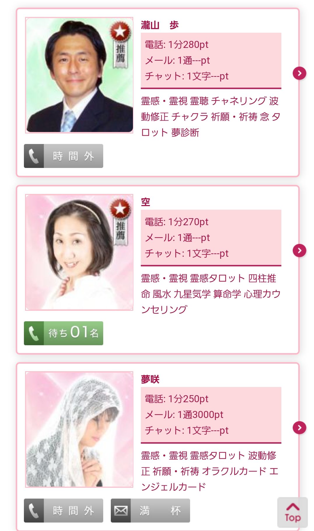 電話占い業界では比較的新しいサイトですが、掲示板などの口コミに「当たる」、「占い師のレベルが高い」など、高評価の声が多いのが特徴ですよ!