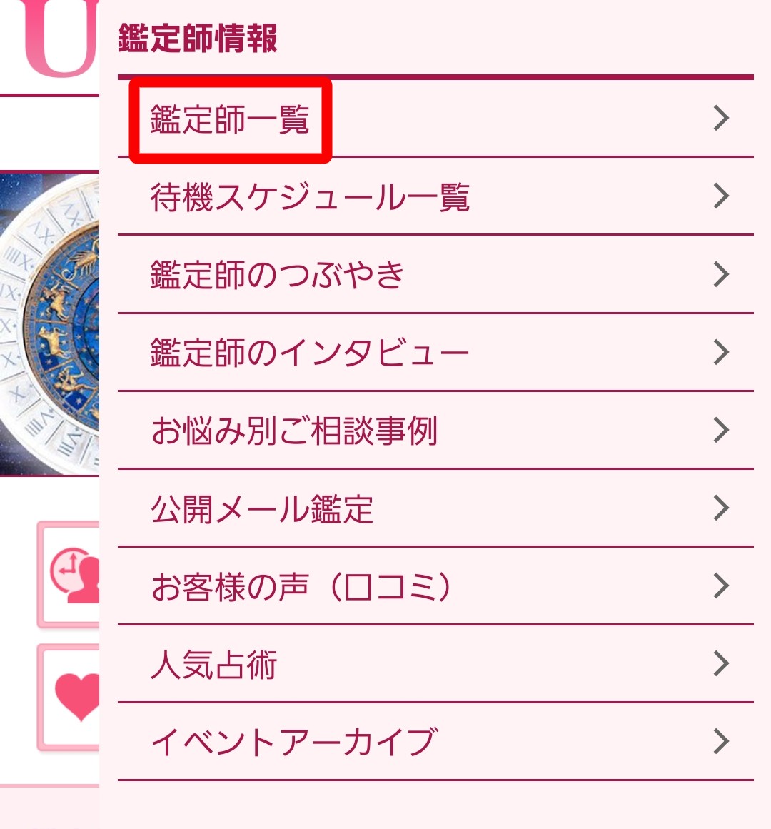 トップページ右上の「≡」をタップ後、「鑑定師一覧」をタップします。