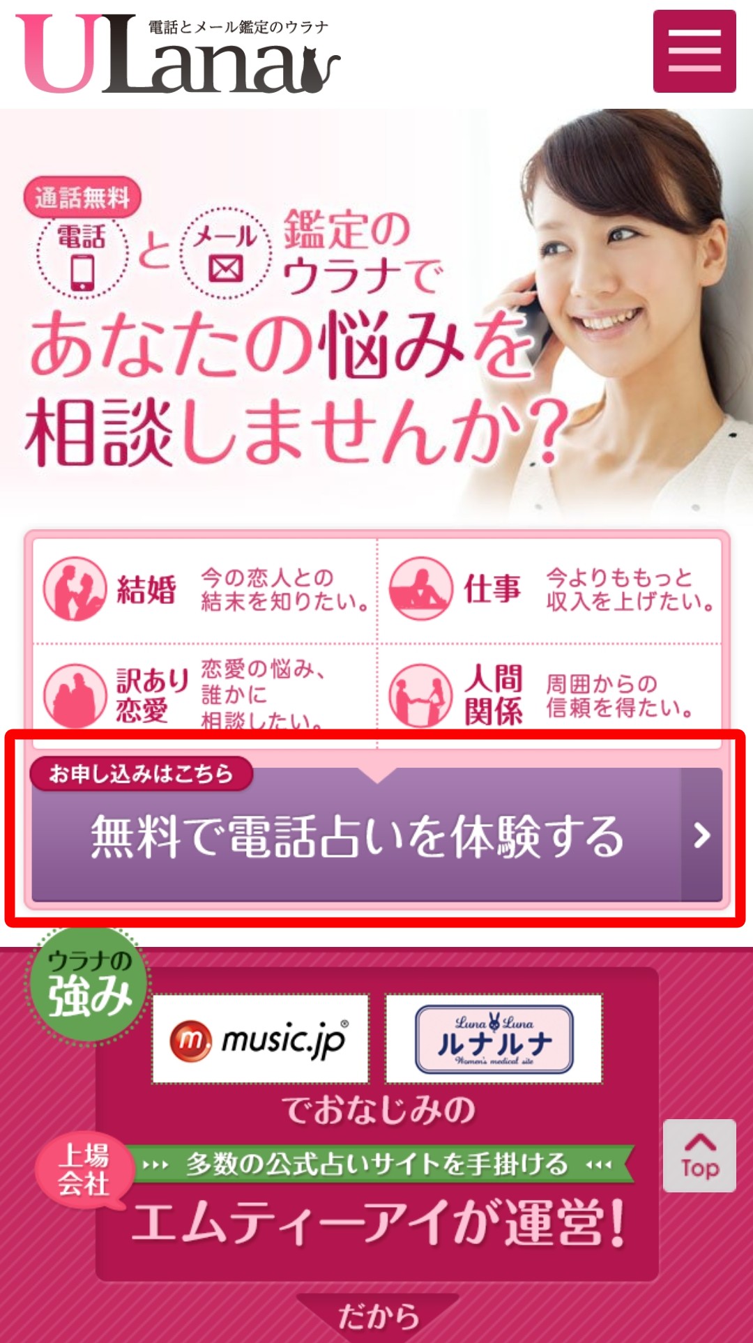 電話占いウラナ(ulana)は、東証一部上場企業の(株)エムティーアイが運営している電話占いサービスです。