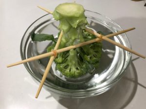 蕾を下にして浸けようと思っても、浮いて来たり倒れてしまうので、箸で固定しました。