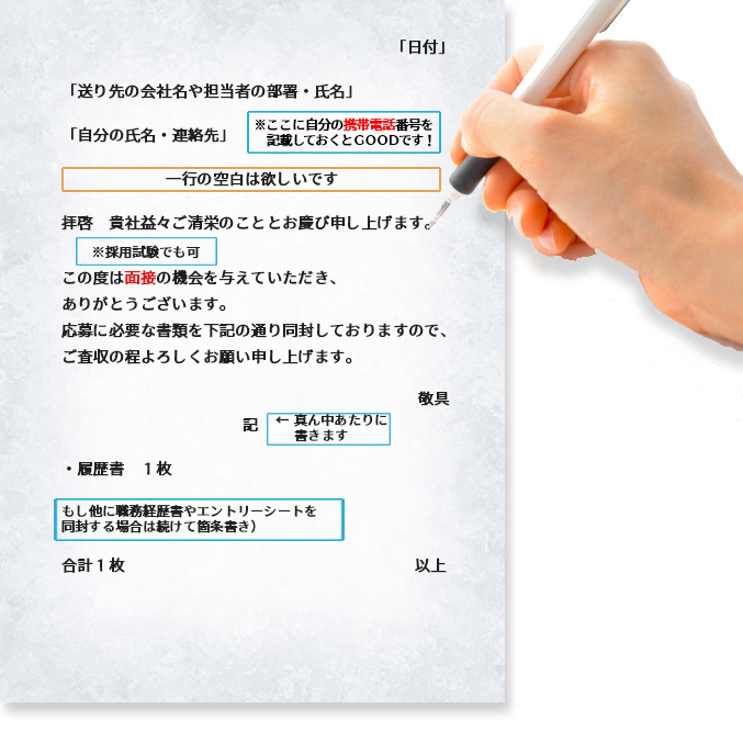 新卒の就職採用試験の場合は、送付状と履歴書の他にもエントリーシートなどを同封することが多いかと思います。他方で、転職者の場合は職務経歴書の同封が一般的ですね。