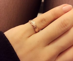 ジュエリーショップの方が教えてくれたところによると、ピンキーリングは何かを持った時や手を挙げたときに指輪の側面が見えやすく、指輪の側面部分の細工にこだわったデザインが多いのだそうです。先程もコップを持った手のピンキーリングは目立って見えるとお話ししましたが、この時に威力を発揮すべくデザインするんだそうですよ。
