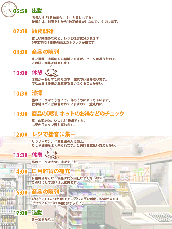 はじめに、コンビニで働き始めて1ヵ月ぐらいで、少し仕事に慣れてきた、あるフリーターにスポットを当てて、1日の仕事の流れをご紹介します。