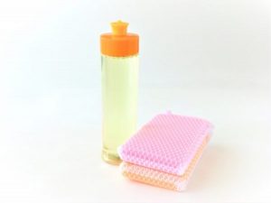 まずは柔らかいスポンジ(いらないTシャツなどの布でもOK!)に食器洗い用の中性洗剤をつけて、力を入れすぎず優しくこすります。