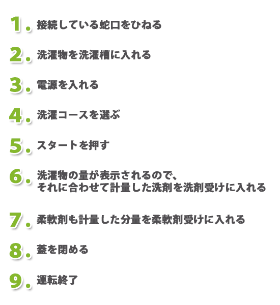 蛇口をひねる→洗濯物を入れる→電源を入れコースを選びスタート→洗剤を洗剤受けに入れる→蓋を閉める - お風呂の残り湯を使う場合も、最後のすすぎは水道水を使う