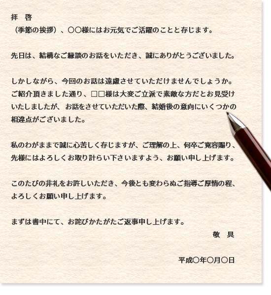 • 目上の人からの紹介でのお見合いは、紹介者の機嫌を損ねないよう、相手に失礼がないように手紙で丁寧にお断りをする。
