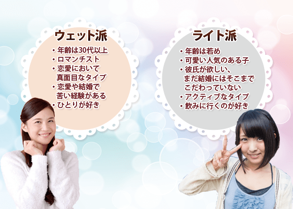 大きく分けると、女性のタイプによって、ライト派かウェット派に分かれます。