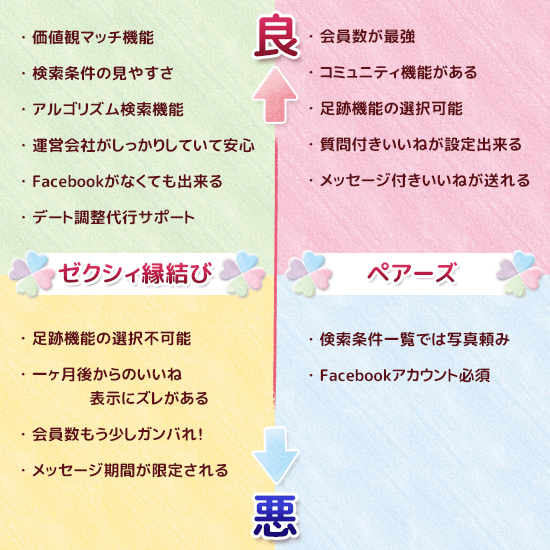 機能面では、ペアーズはあまり言うこと無しで、ゼクシィ縁結びに頑張ってほしいことろは多々あります。